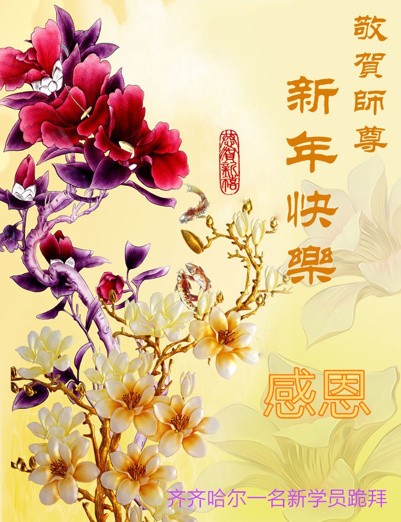 恭祝慈悲伟大的师父过年好! 仰望师尊,感恩师尊!师尊啊,弟子感谢您!是师尊您把弟子从地狱里捞出,给弟子净化了身体,是您改变了弟子无比自私的肮脏思想,重塑了弟子,给了弟子无比荣耀的一切,才有了弟子的今天。 今生能成为您的弟子是何等的幸运啊!弟子用尽人间的语言也表达不了对师尊的感恩。唯有听师尊的话,精進实修,多救人。 叩拜师尊! 齐齐哈尔一名大法新学员敬贺师尊新年快乐!