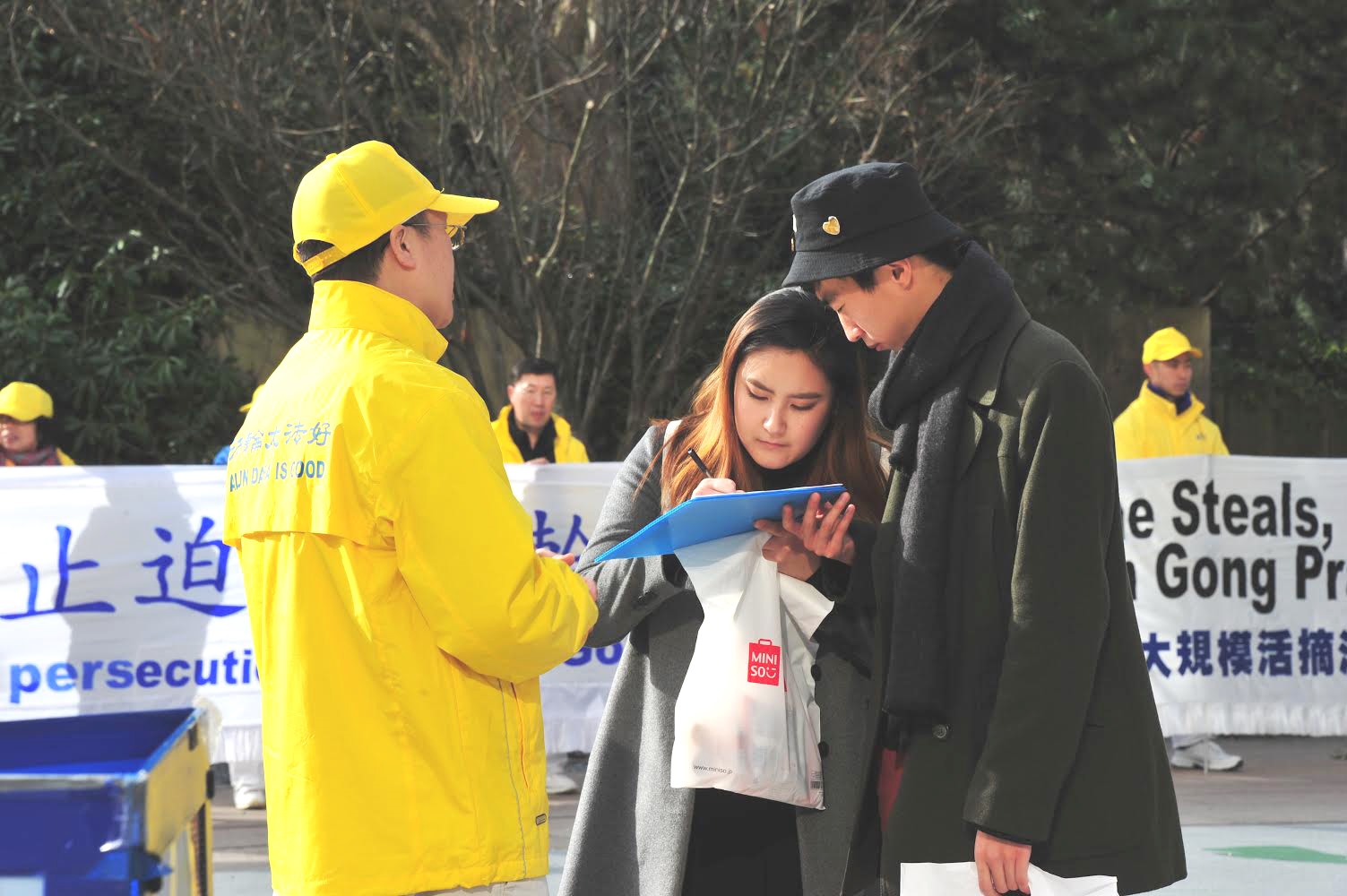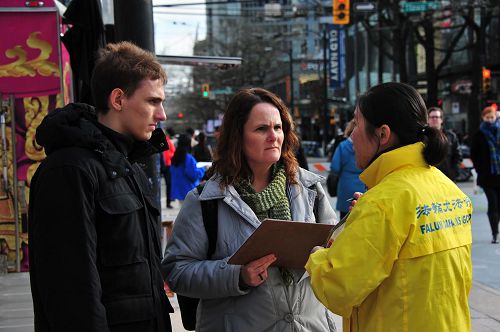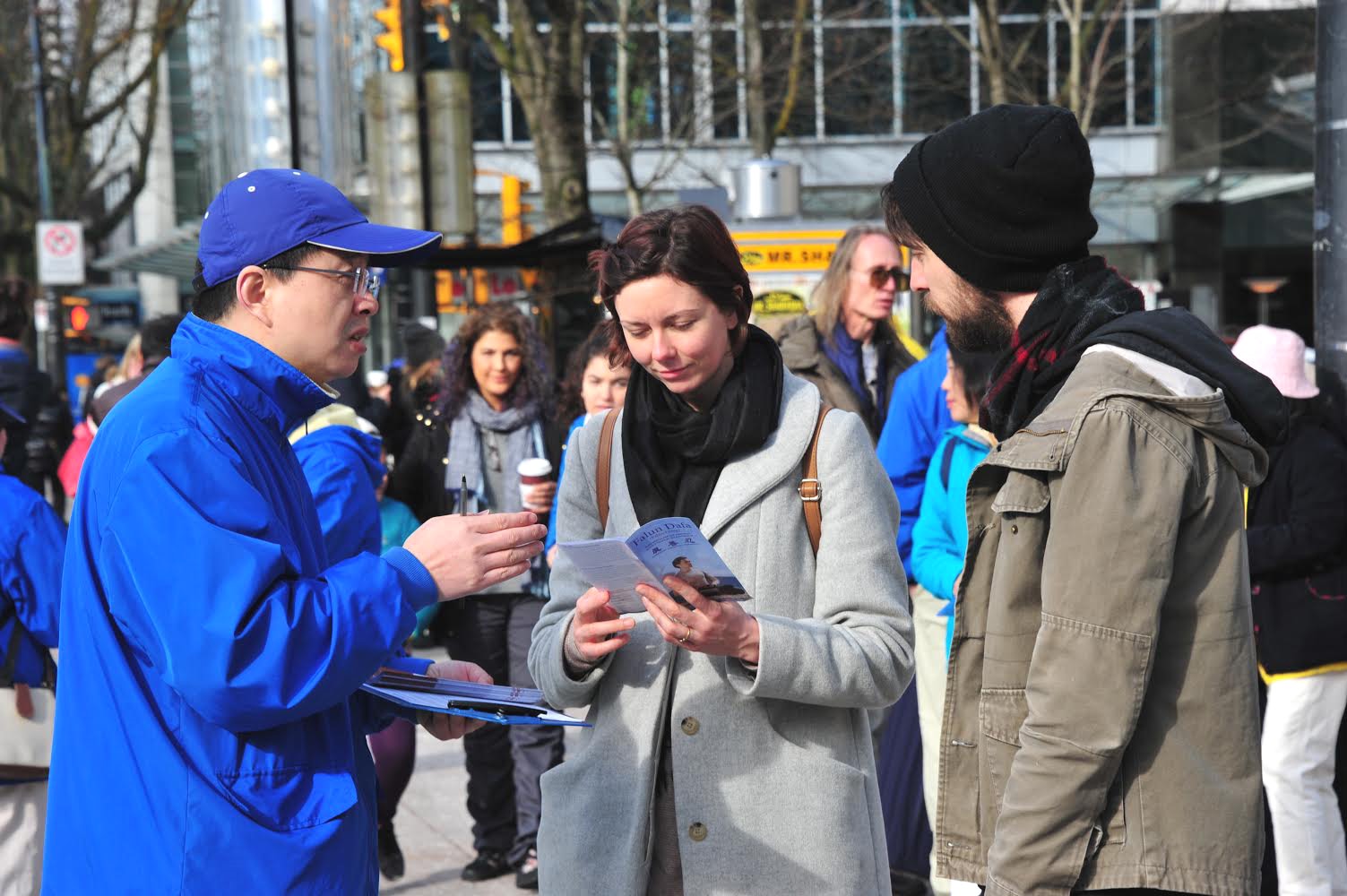 二月十日,阴雨的温哥华冬季迎来了难得的好天气。在中国新年即将到来之际,法轮功学员在温哥华市中心艺术馆前的集体炼功和讲真相活动,吸引了很多过往的行人观看,并纷纷签名支持法轮功学员反迫害。 法轮功学员田先生表示,无数的法轮功修炼者在法轮大法中受益,很多人在修炼前都是疾病缠身,修炼后疾病不药而愈,重新获得了身体的健康,他自己就是其中的一位。修炼二十多年了,他不仅远离了疾病,身体一直很健康,而且连皮肤都变得更有光泽。现在的中国大陆物欲横流,很多人身在其中无法自拔,法轮大法教导人遵循“真善忍”做好人,他自己就是在大法的感召下浪子回头,戒掉了所有不良习气,按照“真善忍”的原则做好人,获得了精神上的安宁,并且在大法的修炼中明白了做人的真正目的,因此对法轮大法师父李洪志先生的感恩无法用语言来表述。借中国新年来临之际,给师父拜年,表达感恩之心。 田先生表示,中国新年习俗之一是送祝福。他也特别想借此机会给世人,特别是华人朋友送来祝福。希望世人都能了解法轮大法的美好,不再受中共造谣的谎言的毒害,真心地珍惜法轮功学员们的努力,静心了解法轮大法的美好,对生命是最大的福音。