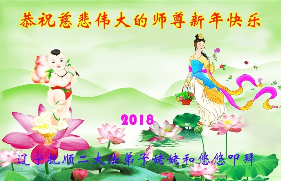 师父好 师父新年快乐! 在新的一年里,当好主角,精進实修,做好三件事,紧跟师父走到底。 辽宁丹东一组大法弟子叩拜 二零一八年新年 辽宁抚顺二大法弟子姥姥和悠悠恭祝慈悲伟大的师尊新年快乐!
