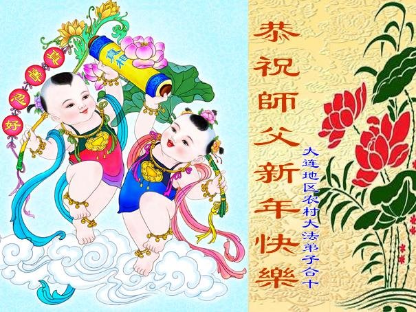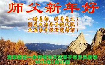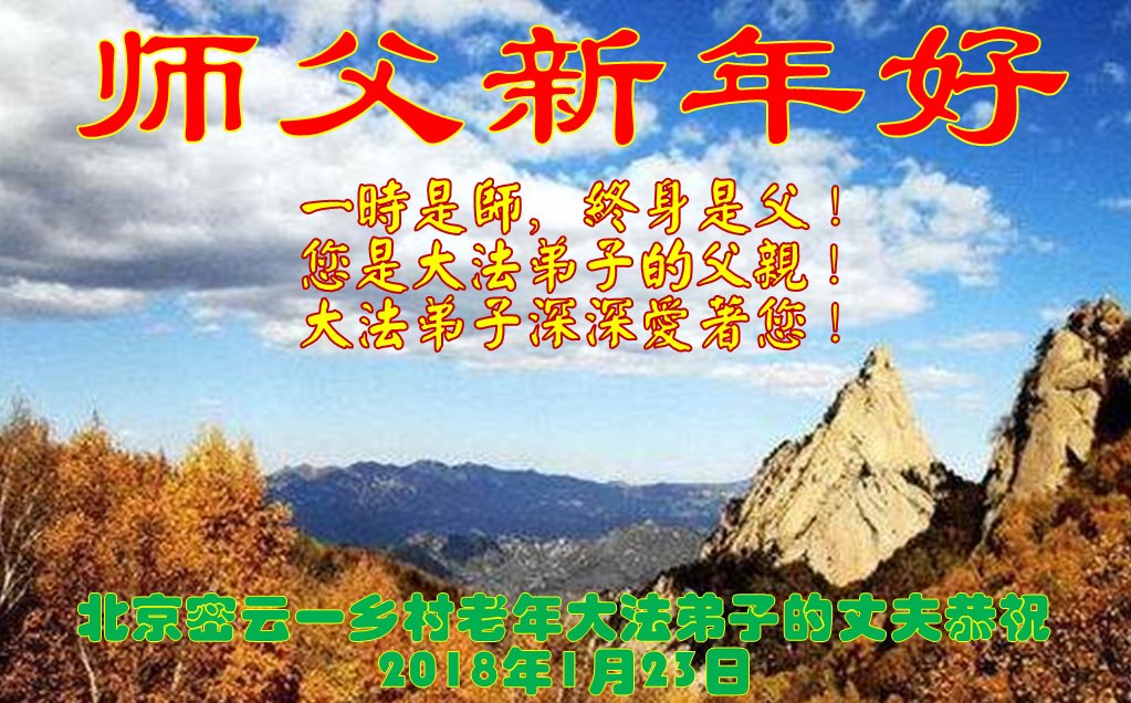 师父新年好!一时是师,终身是父!您是大法弟子的父亲,大法弟子深深爱着您! 北京密云一乡村老年大法弟子的丈夫恭祝 2018年1月23日 辽宁大连地区农村大法弟子恭祝师父新年快乐!