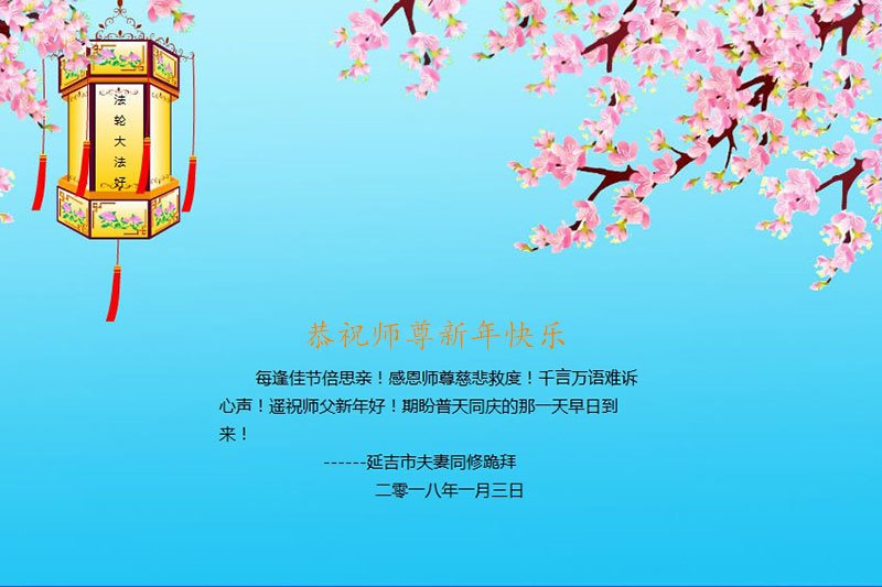 感恩师父!谢谢师父对我们每一位大法弟子的看护!我们会互相配合,做好三件事,跟师父回家! 吉林省通化市一夫妻大法弟子恭祝师尊过年好!