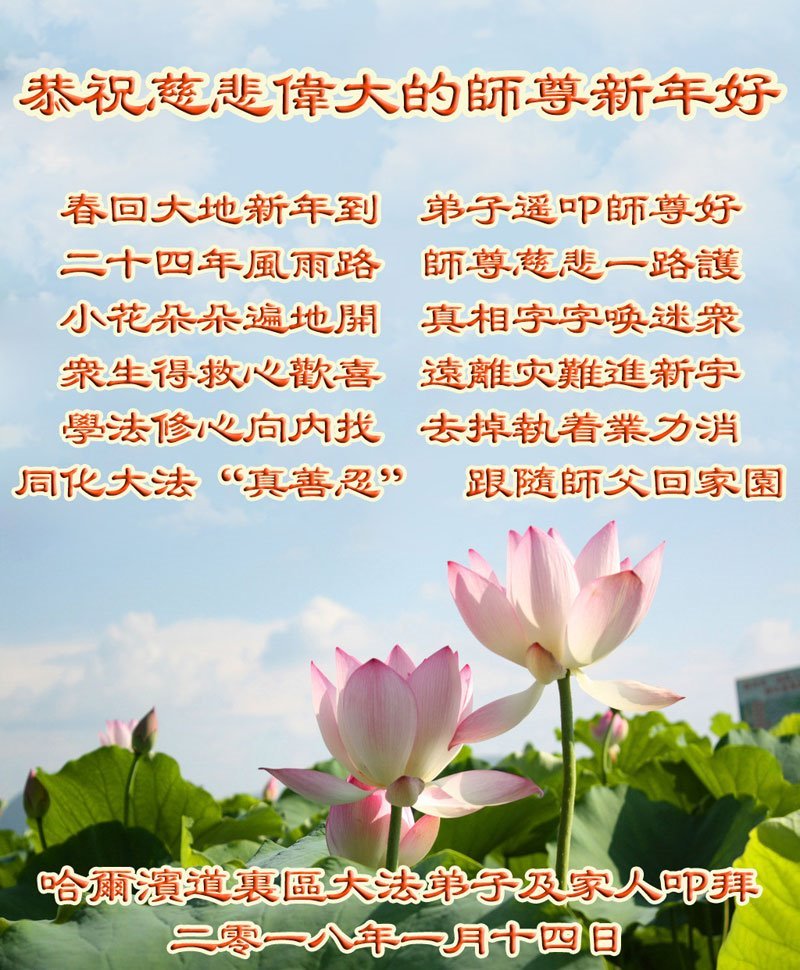 【明慧网二零一八年二月十四日】 黑龙江哈尔滨道里区大法弟子及家人恭祝慈悲伟大的师尊新年好!