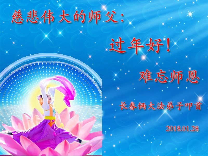 祝师尊新年快乐!过年好!弟子们非常想念师父!要按照师父的要求,做好三件事,学法修心向内找,多救人。 吉林省长春两大法弟子恭祝慈悲伟大的师父过年好!难忘师恩!