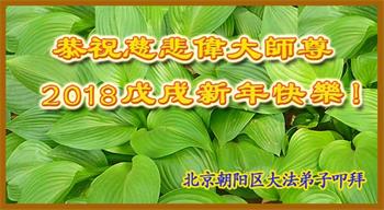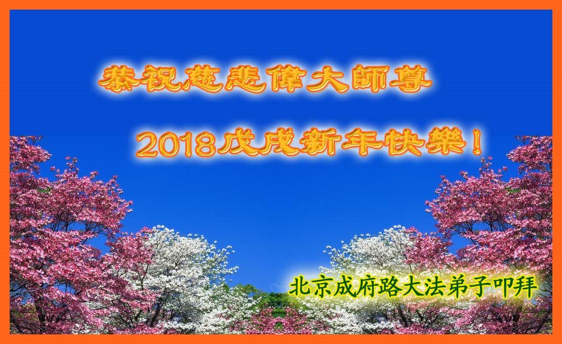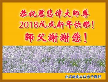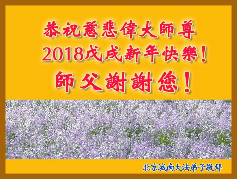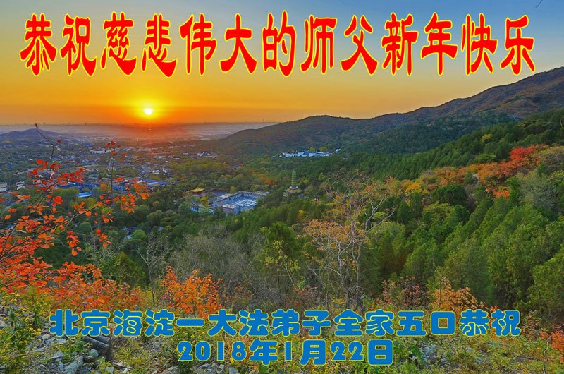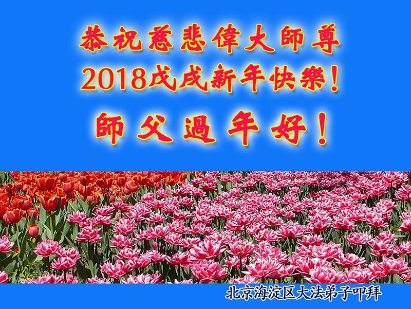 师父您好!师父您辛苦了!您为众生操尽了心,我们要听师父的话,好好学法,在法上提高,多救人。叩拜师尊,合十。 北京朝阳区大法弟子向慈悲伟大的师尊致以最崇高的敬意!恭祝慈悲伟大的师父2018戊戌年新年快乐!