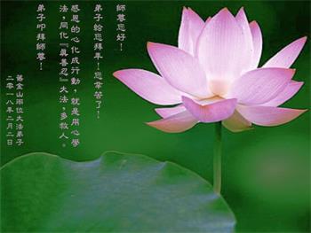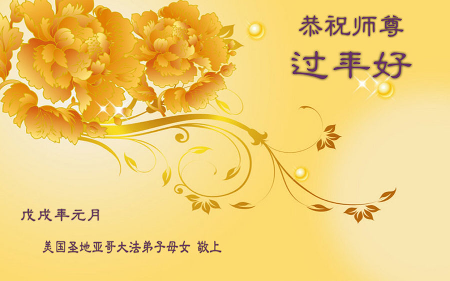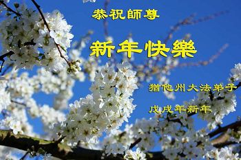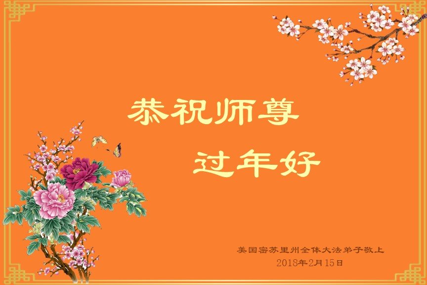 恭祝师尊过年好! 辞丁酉迎戊戌转瞬即到 大法徒遵师嘱深感使命尤为重要 学法炼功正念讲真相救人唯有做好 古稀耄耋之年救众生必需争分夺秒 三亿民众挣脱邪*党-获新生举世欢笑 创世主慈悲苦度救命之恩无以回报 千言万语凝成肺腑之言 恭祝伟大师尊过年好! 美国圣路易犹太公寓全体大法弟子敬上 夏威夷一学法小组恭祝师尊过年好!