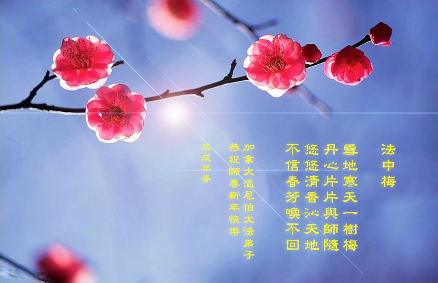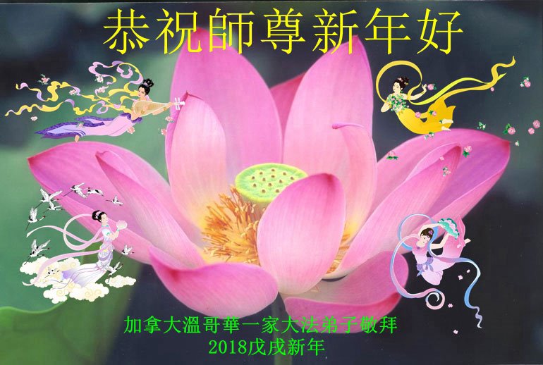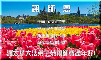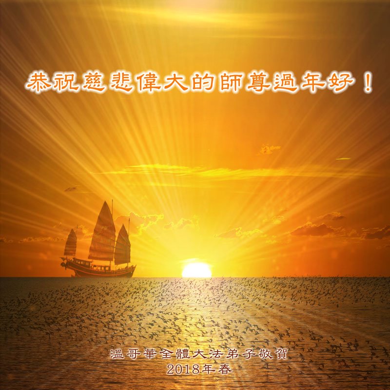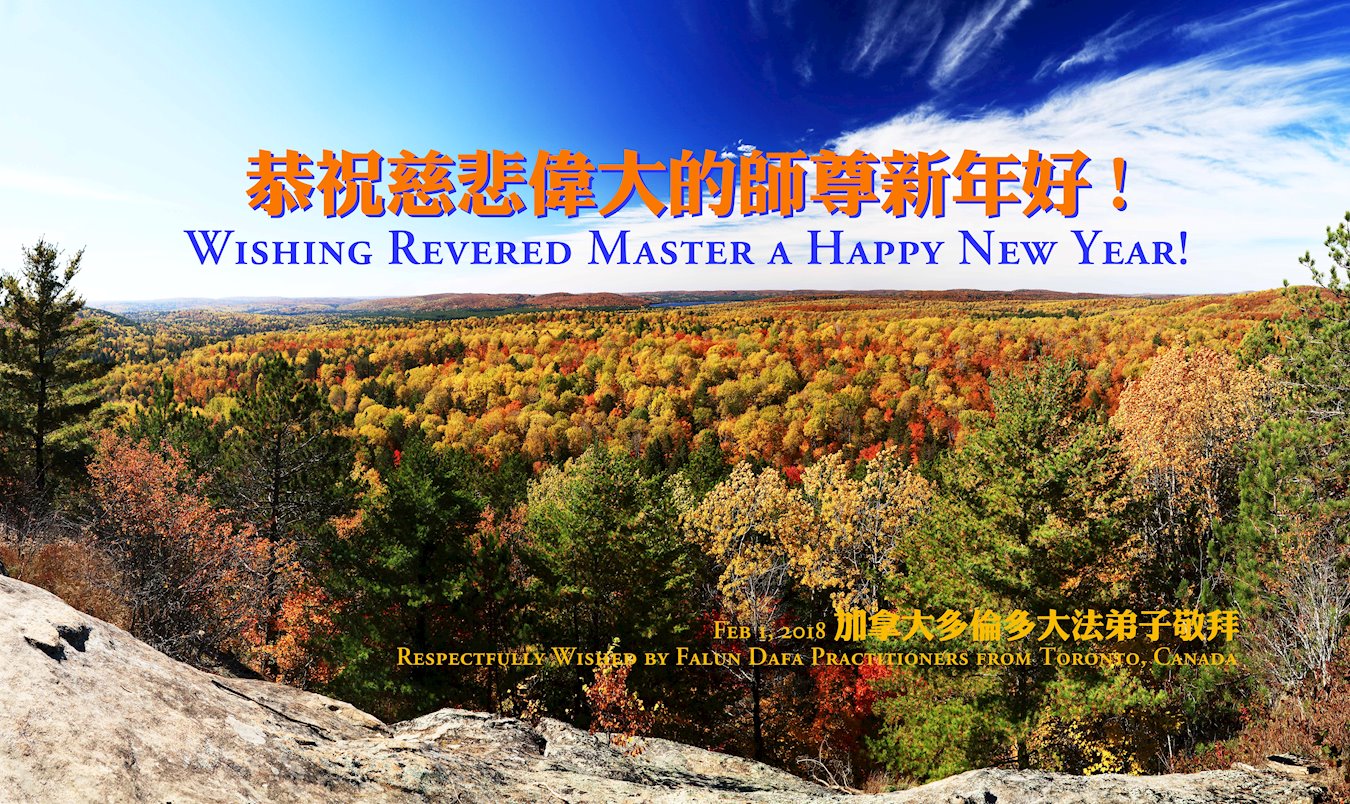 多伦多大法弟子感恩师尊慈悲救度,在新的一年以至更久遠的未来,向内找實修自己,同化大法,與同修配合好,共同提高,完成使命。 多伦多大法弟子敬上 温哥华全体大法弟子恭祝慈悲伟大的师尊过年好!