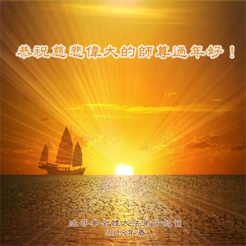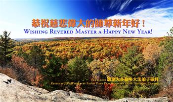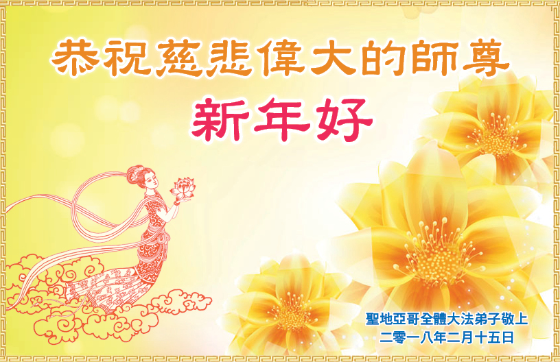 恭祝师父新年好! 师恩贯宇宙 佛法正人间 履誓在今朝 暑寒若等闲 乾坤败物灭 万物生机显 弟子传真相 众生登度船 圣地亚哥全体大法弟子恭祝慈悲伟大的师尊新年快乐!