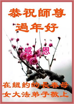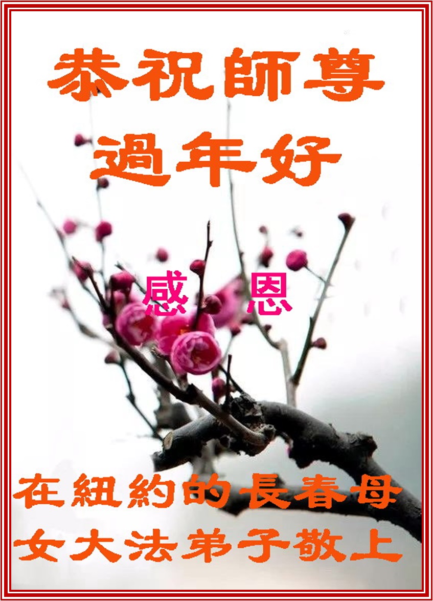 传统的黄历新年是中国人一年中敬天敬神的重要日子。纽约大法弟子在这敬天敬神的重要日子,向慈悲伟大师尊表达心中最真诚的崇敬和感恩。在今后的修炼中,我们要更加珍惜师尊用巨大承受为众生为弟子延续来的时间,学好法,修好自己,做好三件事,勇猛精進,兑现誓约,愿师尊多一些欣慰少一些操劳。 合十 叩拜 纽约大法弟子 美国纽约的母女大法弟子及家人恭祝师尊新年快乐!
