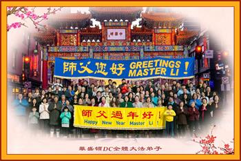 【明慧网二零一八年二月十四日】“宙宇穹苍辞旧颜,人间迈步入新年。师尊普度承千苦,浩荡慈悲语难言。”在二零一八年传统新年来临之际,美国、加拿大、英国、德国、法国、西班牙、俄罗斯、澳大利亚、丹麦、荷兰、瑞典、挪威、克罗地亚、奥地利、瑞士、波兰、芬兰、新西兰、爱尔兰、日本、韩国、越南、马来西亚、泰国、罗马尼亚、保加利亚、捷克、斯洛伐克等二十八个国家多个城市和州县的大法弟子向慈悲伟大的师尊恭祝新年好!感恩师父的浩荡佛恩! 美国华盛顿DC全体大法弟子给师尊拜年!