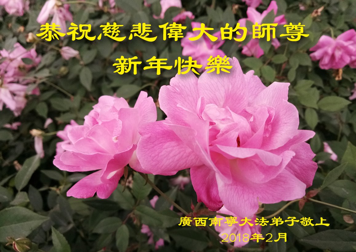 我们会在新的一年里,多学法,学好法,修好自己,助师正法,认认真真的做好三件事,救更多的人,完成使命。祝愿师父新春快乐!希望早日能见到师父。 2018年2月8日 广西玉林市全体大法弟子恭祝师父新年快乐!