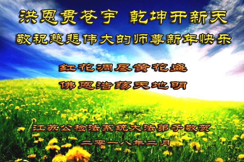 拜谢师尊!恭祝慈悲伟大的师尊新年快乐! 又是新年佳节至,弟子叩首拜师尊 师尊慈悲转法轮,救度众生出泥潭 法理博大超精深,天书句句吐真机 神功简易唤人心,身心奇变脱苦海 荣耀功德师演化,圣地仙境呈眼前 儿孙世代享福荫,受益无法言语表 师尊慈悲担万难,天上人间苦操劳 耗尽所有解万劫,法正乾坤挽狂澜 师赐法宝惊天地,正念正行路通天 法徒立掌灭恶尽,广传真相润心田 千年轮回盼得救,人心唤醒迎新日, 拜谢师尊恩无量,同化大法随师还。 江苏大法弟子恭祝师尊新年快乐!