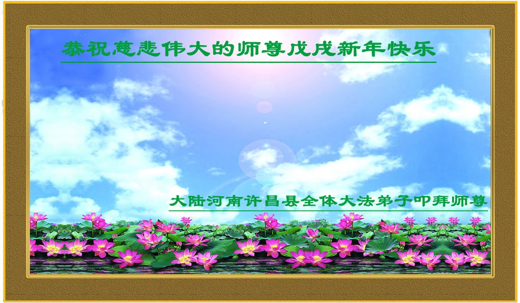 师父您好!在新春佳节到来之际,我们学法小组全体弟子向师尊致以最亲切的问候!大家都非常想念师父!一年来,在师父的保护下,我们又走过了一段修炼的路程,大家由衷的感谢师父的教诲、感谢师尊的苦度!在新的一年里,我们要更加严肃对待修炼,认真做好三件事,给师父交上一份满意的答卷。再次恭祝师尊新年快乐! 河南许昌县全体大法弟子恭祝慈悲伟大的师尊戊戌年新年快乐!