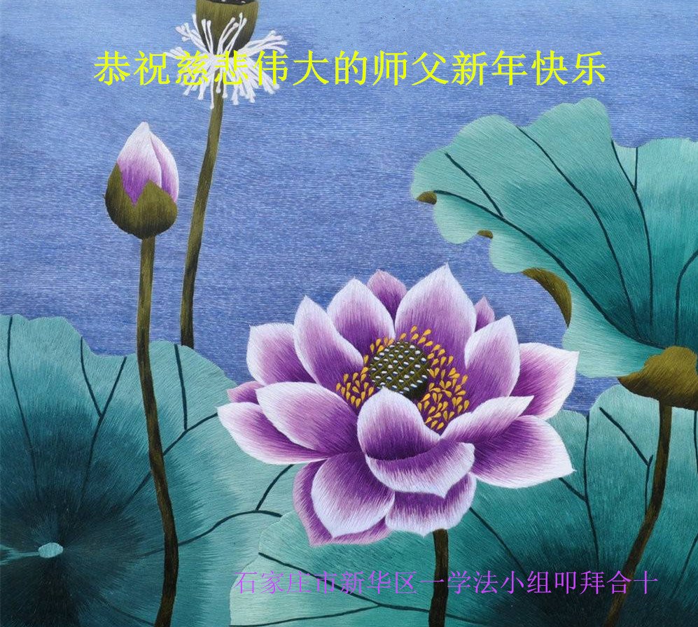 新年谢师尊 慈悲师父正大穹 弟子助师除邪顽 努力做好三件事 感谢师尊苦救度 忍苦精進去执着 坚定同化真善忍 五套功法刻苦炼 精進实修神体显 待到圆满那瞬间 紧跟师尊把家还 喜迎春 亿万净莲清又纯 历经酷寒傲香沁 师尊呵护倍加持 唤醒百花喜迎春 春到雪溶残寒尽 邪*党-解体天地新 得救众生齐感恩 大法弟子迎师尊 河北辛集市一学法小组全体敬上 河北省石家庄市新华区大法弟子恭祝师尊新年快乐!