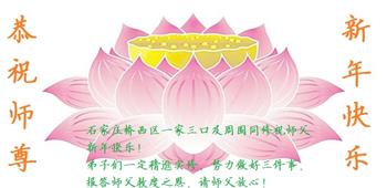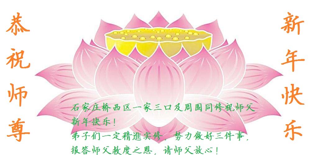 石家庄市新华区一讲真相小组全体大法弟子遥祝师尊过年好!弟子们想念师父!我们一定修好自己,做好三件事,用实际行动多救人,让师尊多一份欣慰,少一份操劳,跟师尊走到正法的最后一天。请师尊放心! 河北省石家庄桥西区三位老年大法弟子恭祝师尊新年好