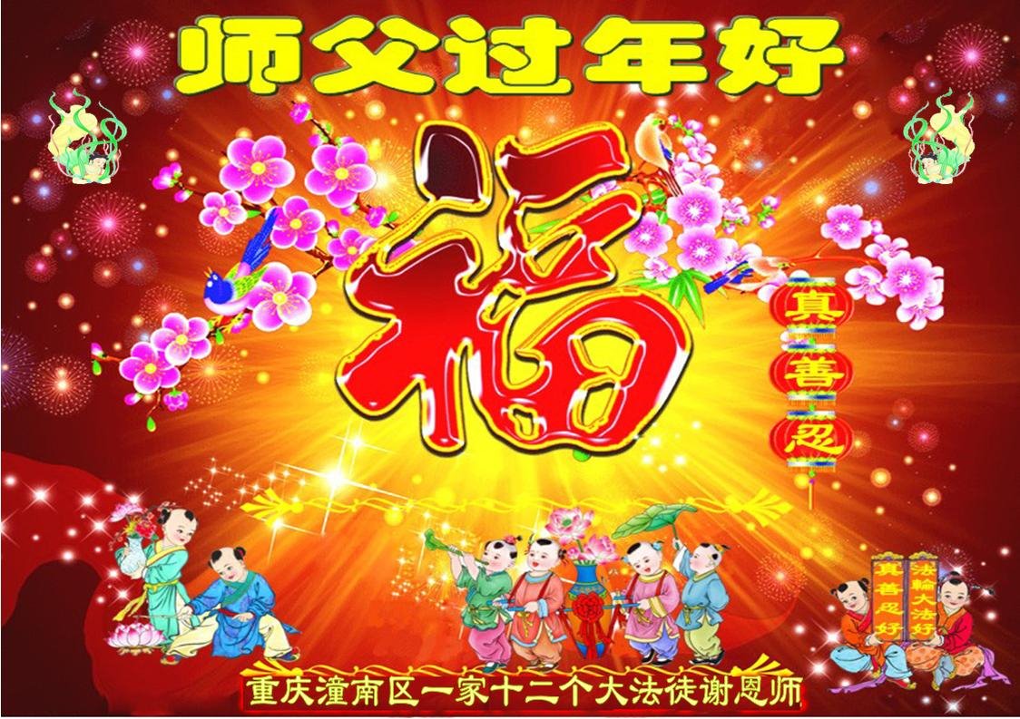 恭祝慈悲伟大的师尊过年好! 感谢师父选择我当您的弟子!成为这宇宙天体中最幸运、最幸福的生命。在正法的最后时刻,精進实修,多救众生,圆满随师父回家。 在此我还代表家中明真相并受益的家人向师父拜年! 重庆市沙坪坝区大法弟子携家人叩拜! 重庆市沙坪坝区一学法小组全体大法弟子恭祝师尊新年快乐!
