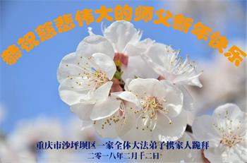 恭祝师父新年快乐! 感谢师尊慈悲苦度,我一定要紧跟正法進程。学好法,做好三件事,跟随师父回家。 重庆市沙坪坝区大法弟子敬拜! 一重庆大法弟子全家给慈悲伟大的李洪志师尊叩拜新年!
