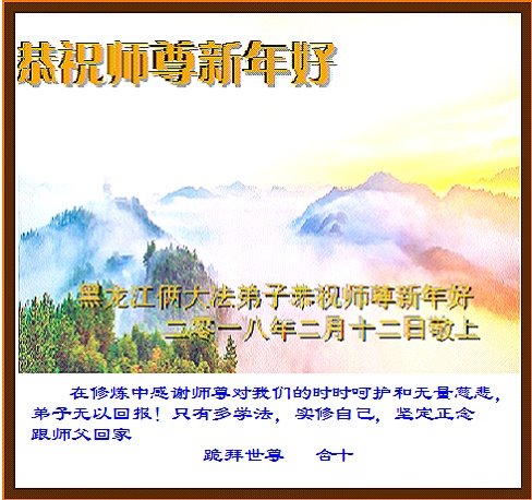 恭祝师父新年快乐!弟子们一定要做好三件事,让师父放心。 黑龙江省绥化市北林区大法弟子:四姐妹学法小组 2018年2月8日 恭祝师尊新年快乐!弟子跟随师父修炼多年,修去了很多执着及不好的人心,在师尊一路的保护下不断的提高自己的心性,升华自己的层次。在合家团圆的节日里,弟子给您拜年了,叩谢师恩,感恩师尊的慈悲救度,弟子谨记师尊教诲,走好最后的路,跟师尊回家! 黑龙江省绥化市北林区大法弟子 黑龙江大法弟子恭祝师尊过年好!
