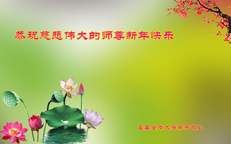 在新年到来之际,弟子恭祝师尊新年快乐!感谢师尊给了我第二次生命,茫茫苦海双手把我托起,在我病魔缠身、希望俱灭的时候,幸遇大法才摆脱了我苦难的人生,千言万语道不尽十九年来师尊的慈悲保护;八十五岁的老父亲受益于大法,癌症晚期医生断言最多活半年。一年过去了、一分钱没花安然健在,每天诵念大法好;公婆也受益于大法、身体健康,全家和睦相处。对师父的天恩,千言万语汇聚一句话,师父新年好!法轮大法好!师父您辛苦了!弟子在新的一年里,我一定精進实修,做一个合格的大法弟子,才不辜负师尊的慈悲苦度。 河北保定蠡县全体大法弟子恭祝慈悲伟大的师尊新年快乐!