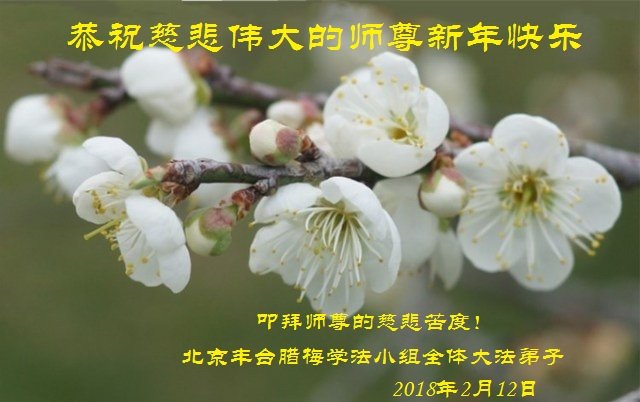 北京丰台区一修炼之家,在戊戌年新年之际,叩谢师恩,感恩师尊的慈悲苦度,弟子们将继续做好三件事,修好自己,助师救度众生。师父您辛苦了!再次跪拜恭祝师尊新年好! 北京丰台腊梅学法小组恭祝师尊新年快乐!