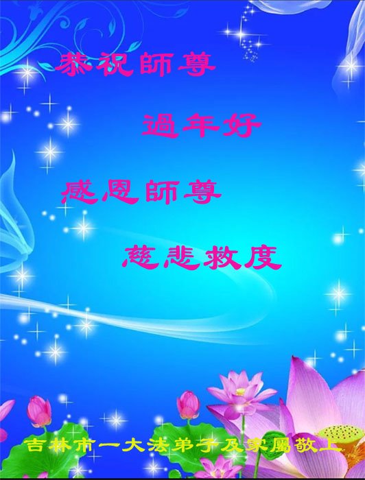 在一年一度的中国新年来临之际,家乡的弟子更加想念慈悲伟大的师父。此时世界上没有语言能表达我们对您慈悲苦度的无限感恩和我们对您的无限思念。我们深深懂得自己的责任。我们是众生得救的唯一希望。我们会坚定的跟师父修炼到底。真修和实修自己的一思一念,努力做好三件事,完成自己来世的大愿!助师正法,救度众生,以报师恩。家乡弟子跪拜师父! 吉林市大法弟子代表全家恭祝师尊新年好!