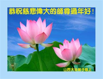 感谢师父大法洪传,救度众生,感谢师父告诉我们用真善忍做人。希望迫害尽快结束,还神州一片静土。 山西省汾西县兄弟二人敬上,叩谢师父。 山西省太原全体大法弟子恭祝慈悲伟大的师父过年好!
