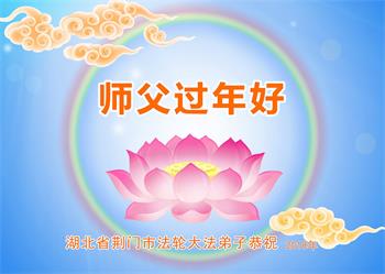 慈悲伟大的师父新年好,您辛苦了! 弟子感恩师父的救度,用真善忍的圣水洗去了名利情的淤泥。在珍贵的修炼时间里,弟子要挖根去执着,做好三件事,跟师父回家。 湖北省荆门市大法弟子恭祝师父过年好!