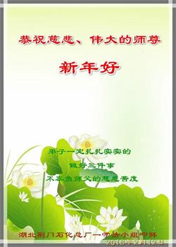 师尊过年好!师尊您辛苦了! 通过学法,我们修炼的意志才变的越来越坚强,在大法法理的指导下,我们才能走过每一关每一难,才能一点点的修去顽固的执着。我们明白只有认认真真的修炼好自己,踏踏实实的做好三件事,才能走好修炼的路,才能完成大法弟子的救人的使命!在新的一年里,弟子们唯有精進再精進才能报答师尊的慈悲救度。 东西湖区全体大法弟子叩拜师父 湖北省随州市大法弟子恭祝师尊新年好!