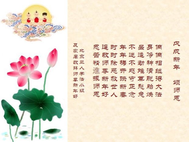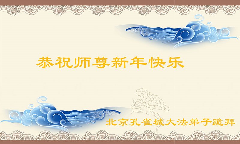 尊敬而又慈悲的师父过年好!在中国新年即将来临之际,弟子们在北京给您拜年了,恭祝您新春愉快!请师父放心,弟子们将按照您的教诲,正法不止,精進不停。再次感恩师父的慈悲与呵护!敬拜叩首! 北京顺义区大法弟子恭祝师父新年快乐!