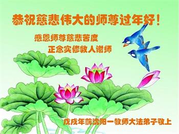 慈悲伟大的师父好!在戊戌新年到来之际,敬祝师父新年快乐!我们是才得法修炼二十个月的老年夫妻新弟子,曾是人民教师,国家干部。由于江氏流氓集团对法轮大法的污蔑诽谤造谣抹黑,我们深受其害,对法轮功不但不理解,还很抵触。直到2016年四月,师父您安排了有缘人给我送来了真相资料和真相光盘,让我们彻底明白了真相并走入大法修炼。一年多来我们深感法理的博大精深和祛病健身超常神奇。我们虽然姗姗来迟,但一定要在实修中精進。把大法的神奇美好告诉我们的亲朋好友,让他们也明真相,得法修炼。谢谢师父!敬祝师父新年快乐! 辽宁省沈阳铁路大法弟子、教育系统大法弟子恭祝慈悲伟大的师尊过年好!