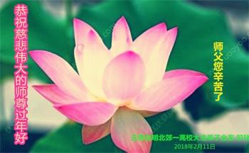 感恩师尊在我修炼道路上的慈悲保护!在大法修炼中,师尊为我开智开慧,使我一个学校排名很差的高中生奇迹般的考上了研究生,同时身体也有很大改善!我还有很多的执着,我真希望自己在新的一年里抓紧修炼、去掉执着,为救度众生尽浅薄的力量。 再一次感谢师尊的慈悲救度!祝师尊新年快乐! 唐山一青年大法弟子 2018年2月11日星期日 黑龙江哈尔滨教育系统大法弟子恭祝慈悲伟大的师尊新年快乐!