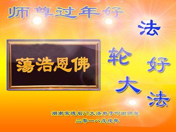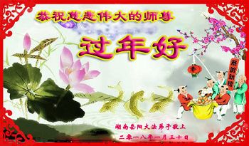 春回大地万象新 中华儿女迎新年 同颂师尊慈悲度 同祝师尊新年好 二零零八年二月九日 湖南省娄底市新化县全体大法弟子恭祝慈悲伟大的师尊新年快乐!