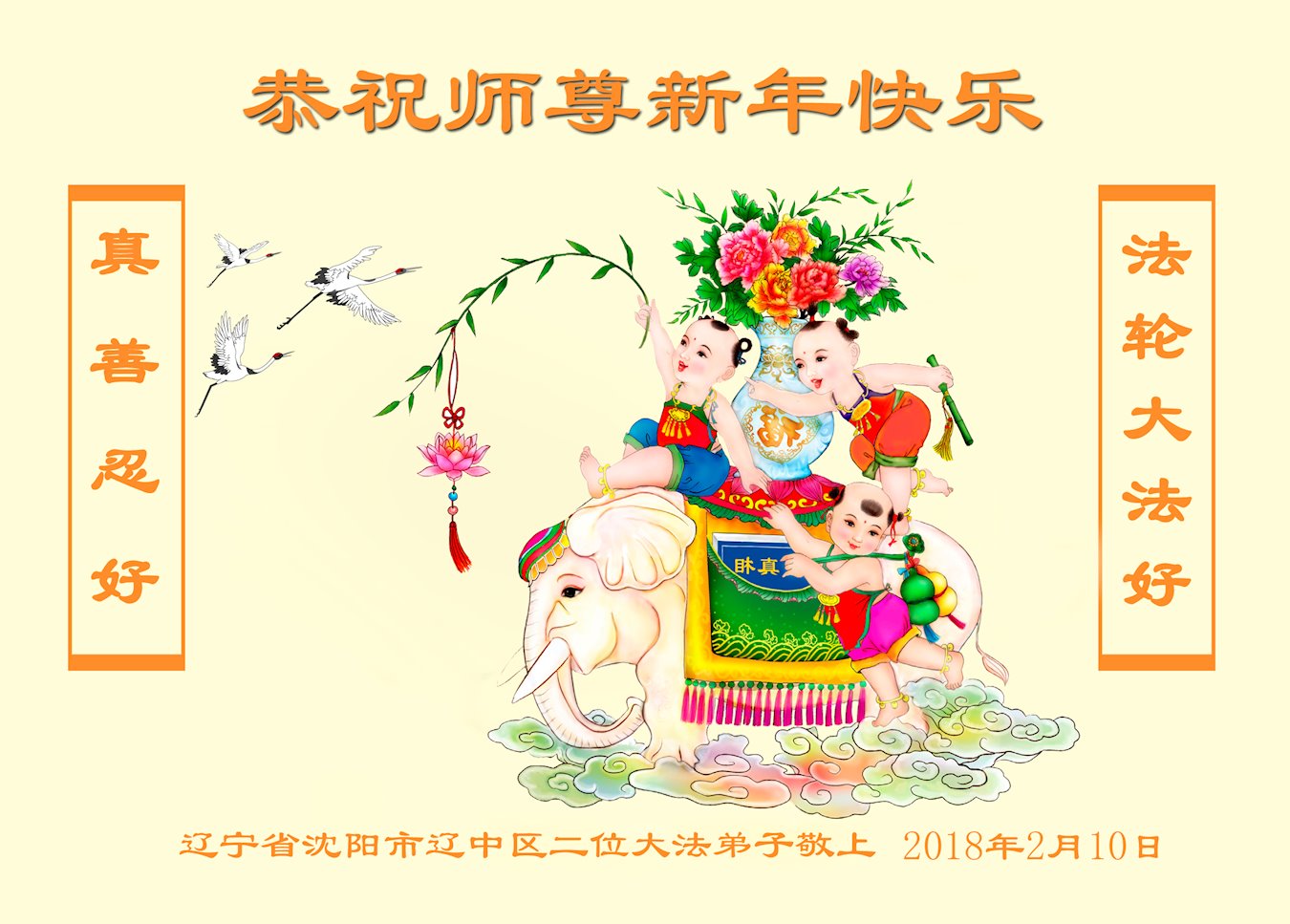 慈悲伟大的师尊:您好!师尊辛苦了! 在二零一八年新年即将来临之际,我们恭祝师尊新年快乐! 弟子们将永远铭记、无限感激师尊的慈悲救度之恩!弟子们决不执着于常人的社会形势,将继续勇猛精進,多学法,遇到矛盾无条件的向内找,在修炼心性上狠下功夫,抓紧时间实修;全力做好三件事,多救人,快救人,兑现史前誓约,功成圆满,共乘师尊法船回家! 弟子们向师尊叩首!给师尊拜年了! 辽宁省沈阳大法弟子给师父拜年!恭祝师尊新年好!
