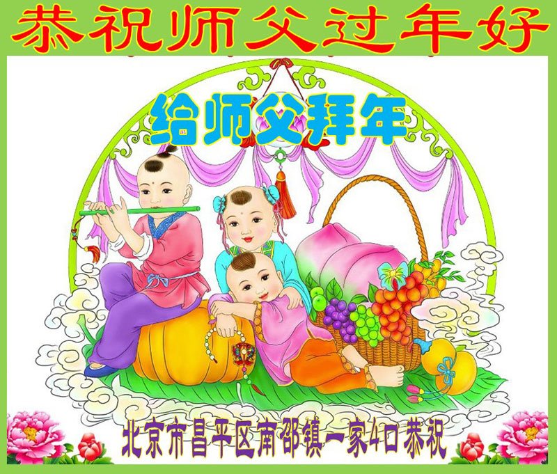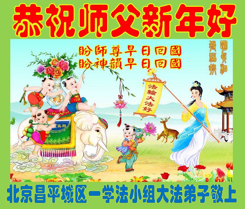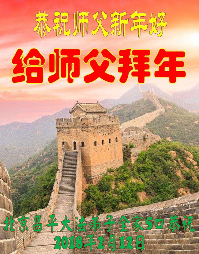 师父新年好!谢谢师父让我们全家九口都好!感谢您传大法,度了我们,我们从内心感谢师父!祝师父新年快乐! 北京昌平城区一大法弟子恭祝师父新年快乐!