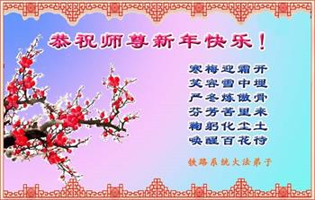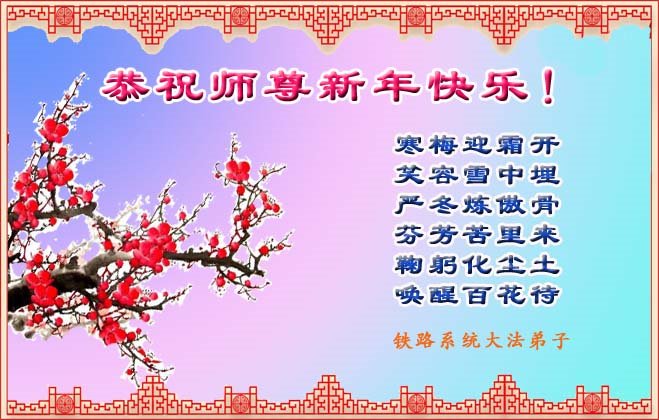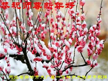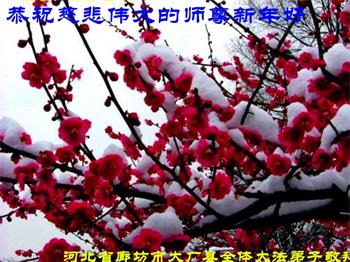 寒梅迎霜开 笑容雪中埋 严冬炼傲骨 芬芳苦里来 鞠躬化尘土 唤醒百花待 甘肃省纺织系统全体大法弟子恭祝慈悲伟大的师尊新年快乐!