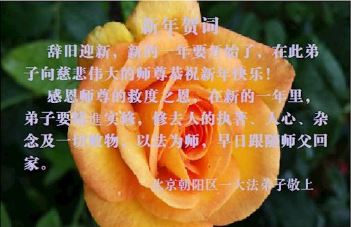 感谢师尊二十年多来对大法弟子的慈悲呵护! 感谢师尊对所有众生的慈悲救度!特别是对被中共邪*党-谎言毒害了的中国人的慈悲救度! 师父伟大!大法伟大! 北京朝阳区劲松大法弟子恭祝师父新年快乐!