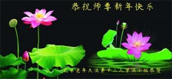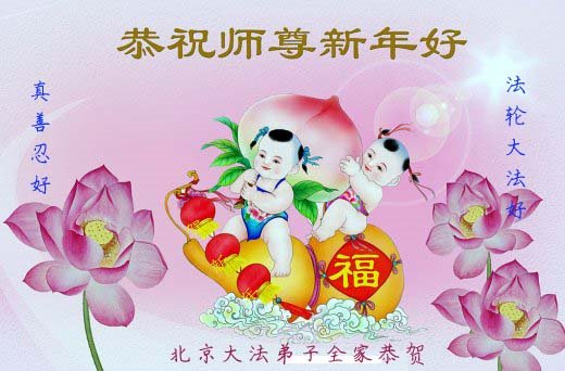 师父洪恩传大法, 满贯苍宇福泽众。 弟子唯有再精進, 兑现誓约返家园。 北京一大法弟子全家恭祝师父新年快乐! 北京一老年大法弟子三人学法小组恭祝师父新年快乐!