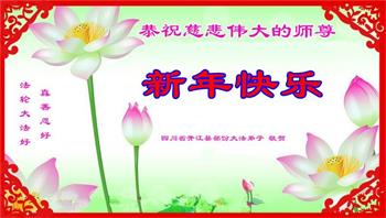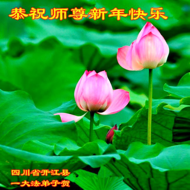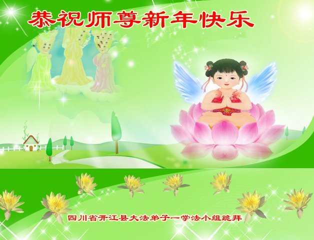 尊敬的师父:您好!师父新年快乐! 我是一九九八年得法的老弟子了,在大法修炼中,在师父的保护下我走过来了。在一九九九年七二零时,中共恶党迫害法轮功时,由于怕心当时没有走出来,导致两次被病魔迫害,但我心中一直是信师、信法,在师父的保护下最终还是走过来了。 现在到了最后的时期,我一定要学好法,听师父的教导,做好大法弟子应该做的事。 四川省达州市开江县大法弟子一学法小组恭祝慈悲伟大的师尊新年快乐!