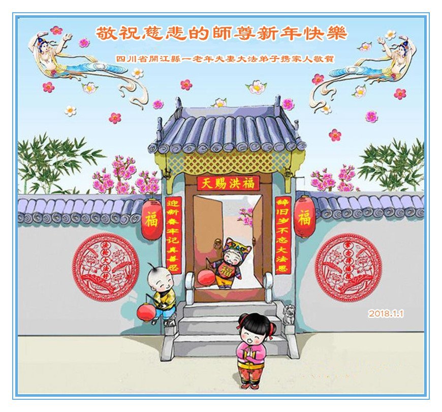 当新年即将来临之际,我们向恩师问候。 四川遂宁市一八旬夫妻大法弟子 叩拜 二零一八年一月二十八日 四川绵阳市一大法弟子及全家人恭祝师爷新年快乐!