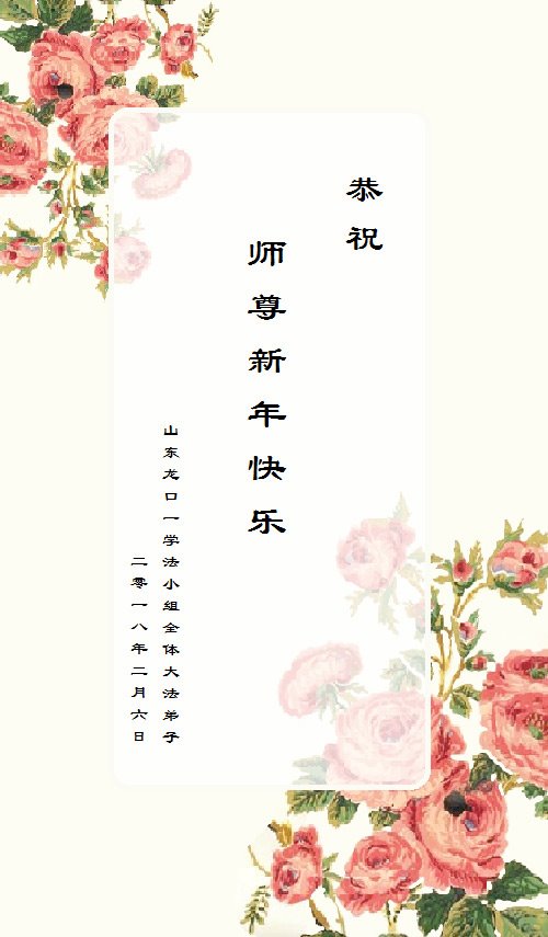 二零一八年新年来临之际,山东烟台一学法小组大法弟子及家人:给师尊拜年!了,恭祝伟大、慈悲的师尊新年快乐!在新的一年里,弟子们只有精進、精進再精進,做好三件事,多救世人,助师正法,请师尊放心!惟愿师尊笑! 山东省大法弟子祝师父新年快乐!