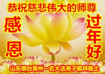 感恩师父的慈悲救度!双手合十,叩拜师尊! 山东一大法弟子跪拜师尊!恭祝师尊新年快乐!弟子一家人千言万语也说不完对您的感恩! 山东全体大法弟子恭祝慈悲伟大师尊过年好!