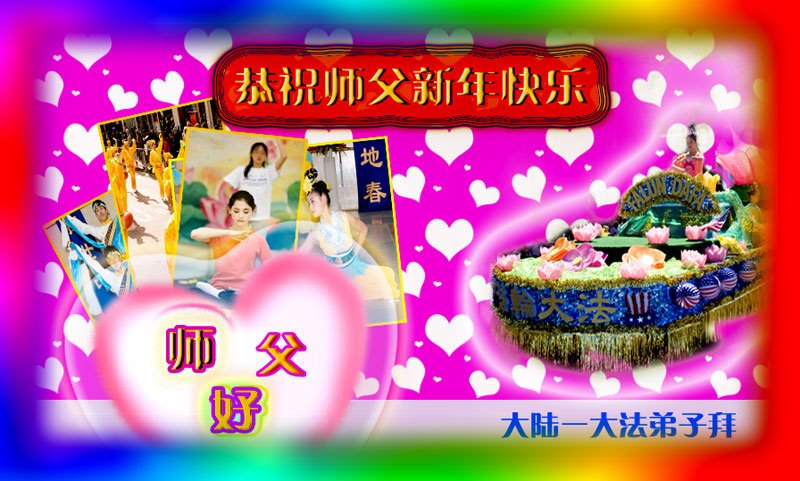 师父过年好!师父辛苦了!弟子叩拜师父!弟子非常想念师父,感恩师父,感恩师父时时的慈悲保护,感恩师父的慈悲苦度!师父给予弟子的太多太多了,弟子却无以言表,无以为报,唯有在修炼路上精進、精進、再精進,惟愿师父笑!弟子再一次叩拜师父!恭祝师父过年好!新年快乐!谢谢慈悲伟大的师父!合十 山东省烟台市龙口市全体大法弟子给师尊拜年!恭祝师尊过年好!