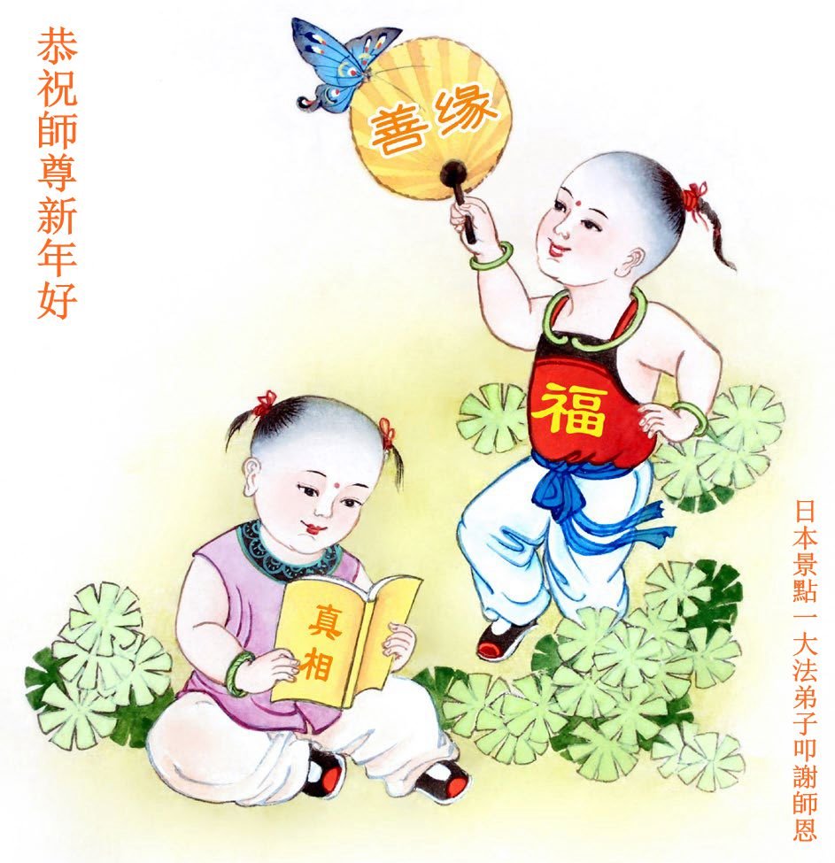 弟子叩拜师父新年好!永远感恩师父的慈悲苦度!我每想到师父的慈悲苦度总是泪流满面。我是得法二十多年的弟子了,无论在任何境遇下都努力要求自己按“真善忍”的法理来规范自己的言行。虽然我知道目前自己的修炼状态跟法的要求还差的很远,一路上走的总是跌跌撞撞的,今后我一定要更踏踏实实的修自己,做一个真正的正法时期的大法弟子。 暂居日本的大陆母女大法弟子恭祝师父过年好!