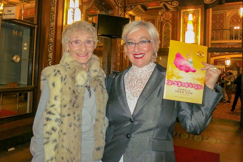 艺名为Suzie Cue的洛克伍德女士曾在波士顿音乐学院学习声乐和音乐剧,她的乐队Sizzle经常在新英格兰地区演出。洛克伍德女士曾获得美国DJ协会(唱片骑师协会)之年度女艺人前三的殊荣。她赞叹神韵非凡的艺术表现力。 她说:“必须有强大自律才能表演出这样的舞蹈。我们熟悉芭蕾,舞蹈训练。神韵让我思绪万千,演员的自律,他们的刻苦努力,我读了节目册,他们每天还要打坐,自我反省。”她自叹不如:“他们所做的,我永远做不到,但我深怀感恩。” 洛克伍德女士说神韵让人思考生命真谛,激励人做好人、善待他人:“我们只是一个小世界,我们在宇宙中如此渺小,宇宙无穷无尽。其中一句歌词说:我们都执着于表面事物,执着于每天的生活。每天我们都在善与恶之间选择,无论是商业决策,人性的抉择,你是贪婪还是慷慨,每天都要做很多选择。我喜爱这些对比,演出中有段情节描绘孩子拿着手机,如此沉溺自我世界,但也有其他年轻人努力学习,能意识到周遭世界,而不是只关注自己。神韵非常激励人心。” 她并表示从神韵中感到宇宙洪大的力量,把所有人连接在一起:“我们好似世界中的一粒沙子,好似沙滩中百万、亿万沙子中的一颗,用宇宙的眼光来看,我们很渺小,微乎其微,同时我们又很强大,我们兼具渺小和伟大,看到天堂,看到创世主是如此能量强大。不知谁是创世主,根据人们在社会上选择的精神信仰来决定,无论是最初的信仰,还是之后发现新的信仰,你走向另外的信仰之路。但是我认为神韵有一种宇宙共有的特性,能够把所有人连接在一起。” 舞蹈公司艺术总监:要向神韵艺术总监深鞠一躬  图11:普罗维登斯一家舞蹈公司及表演艺术工作室的艺术总监乔迪•帕尔米耶(Jodi Palmieri )(右)和其母亲、从事舞蹈表演及编舞长达五十余年之久的朱迪•罗德里格斯(Judy Rodrigues)女士,于二月十日晚一同观看了神韵演出。她们对演出赞不绝口。 |