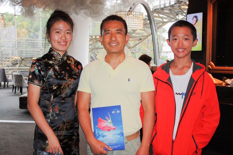 海因里希博士表示:“舞蹈演员们身形像羽毛一样轻盈,当他们做高难度翻转动作时,落地无声,他们的双脚就像羽毛般落在舞台上。美丽至极。” 海因里希博士从事戏剧教学,他对中华传统文化情有独钟。他说:“神韵展现了不同朝代的文化,从汉朝、唐朝、清朝,展现了各朝各代的美丽服装,真是太精美了,美不胜收。” 前大陆小提琴手:神韵才是真正复兴中国  图14:前大陆交响乐团小提琴手谢宏携一对儿女观赏了美国神韵国际艺术团在悉尼Lyric剧院的最后一场演出。 |