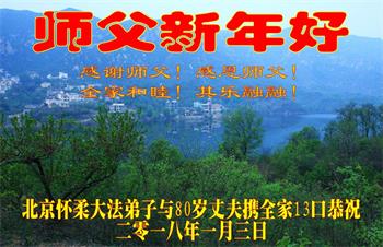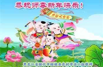 慈悲伟大的师父:新年好! 值此新年来临之际, 向伟大师父合十问好,祝师父新年快乐! 师父的洪恩传苍宇,能成为师父的弟子,我们无上荣耀,任何语言也表达不尽弟子对师父无限的感恩与思念! 在新的一年里,弟子谨遵师命,勇猛精進做好三件事,学好法,修好自己,多救人,完成大法赋予我们的历史使命,圆满随师还。 黑龙江省绥化市绥棱县农村学法小组全体弟子跪拜慈悲伟大的师父! 黑龙江省富裕县二道湾镇农村大法弟子十口之家恭祝师尊过年好!