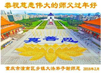 慈悲伟大的师尊您好! 丁酉年过去,戊戌年到来,在新年到来之际,首先向恩师致佳节的祝贺!祝师尊新年快乐! 在新的一年里,我们一定精進再精進,多学法,学好法,努力做好三件事,“踏踏实实的修好自己,完成好救人的使命”(《致法国法会》),兑现史前大愿,跟随师父圆满回家。 高歌同颂大法好 丁酉已过戊戌到 祝愿恩师新年好 法徒精進再精進 助师正法不动摇 踏踏实实修自己 法轮大法光辉照 师救苍生千千万 高歌同颂大法好 石家庄地区农村一学法小组敬贺 重庆市潼南区乡镇大法弟子恭祝师父新年好!