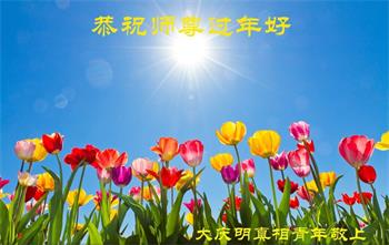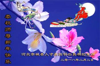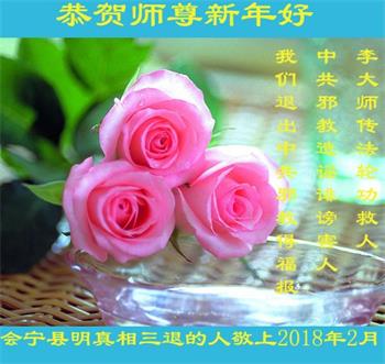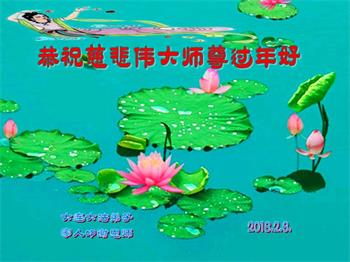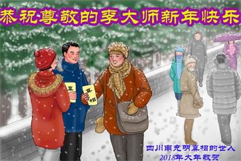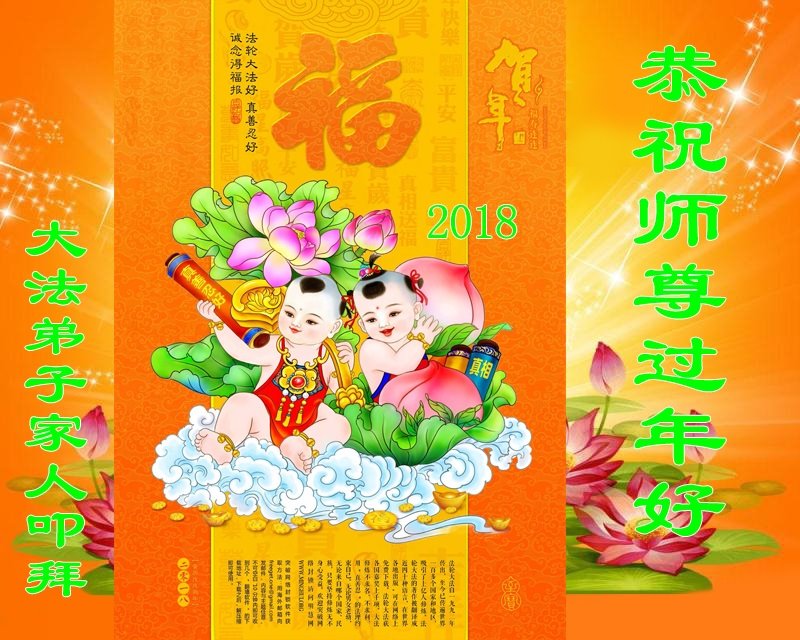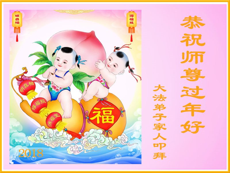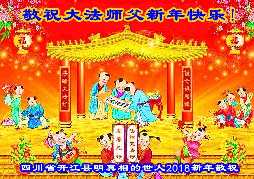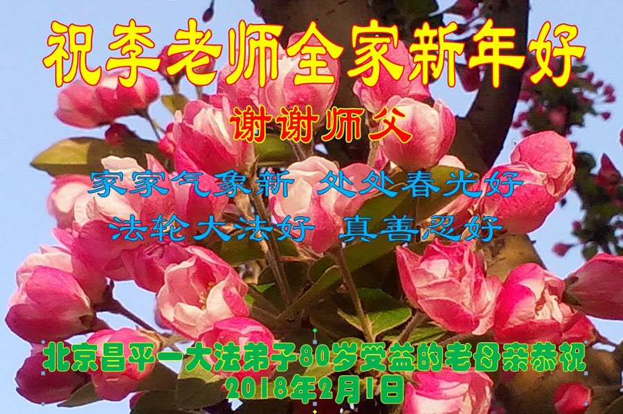 | 【明慧网二零一八年二月十六日】(明慧网记者综合报道)法轮大法是佛法修炼,已弘传世界一百多个国家和地区,给各界众生带来福祉,明白了法轮大法好的百姓,尤其大法弟子身边的亲人,亲身受益。在传统新年,他们恭祝法轮大法创始人李洪志先生过年好! 一位退伍军人明白了法轮大法真相和“三:退.”(退出中共的党、团、队)后,激动的告诉大法弟子:“今天终于明白了,谢谢你们告诉我这么重要的事情,你们是天使。我是党员,退了干净。”他还说:“谢谢李大师,谢谢法轮功!法轮大法好、真善忍好,李大师好、李大师真好!” 一位北京的生意人在给大法师父的信中说:“自从我明白了大法真相,诚念‘法轮大法好、真善忍好’九个字以后,真是发生了根本的改变,从此没有吃过一粒药,我的生意也越来越好,回头客特别多,我知道这一切都是来自于您的赐予。” 一位八十多岁的大法弟子的家属说:“李大师您好!您辛苦了!我今年八十多岁了,一切都好,都是托您的福了!您历尽千辛万苦,在人类没有了道德约束、还在一日千里往下滑的极其危险的情况下,您在传宇宙的大法,挽救着众生,您让众生看到了希望与光明……” 四川南充明真相的世人恭贺尊敬的李大师新年快乐!