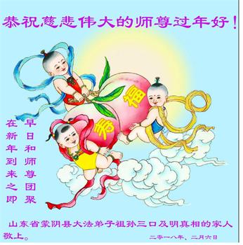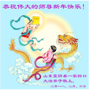 师父过年好!师父您辛苦了! 遥望师尊泪满襟,感恩师尊多年来的慈悲保护使我们这一家庭资料点平稳的走到今天,在新的一年里我们夫妻要多学法,配合整体,让师尊多一些欣慰,少一些操劳,惟愿师尊笑,圆满随师还。 山东省沂蒙山区的大法弟子及明真相的世人恭祝伟大的师尊新年好!