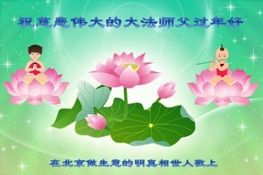 大法师父您好,您辛苦了!在此给您拜年了! 在我人生的旅途当中,能够与您能够相遇在人世间,能叫您一声大法师父,问您一声好,真是三生有幸、祖上有德,是我人生当中最大的幸事,此生没有白来。 自从我明白了大法真相,诚念:“法轮大法好”,“真善忍好”九个字以后,真是发生了根本的改变,从此没有吃过一粒药,我的生意也越来越好,回头客特别多,我知道这一切都是来自于您的赐予。在姐妹们让我和他们一起去信他们的法门时,我说:如果你们再说这些就断绝来往。我既然选择了相信您与大法和大法弟子所说所做的这一切此生无悔,我永远支持你们,谢谢您给予我的这一切。 愿您早日回来。 在北京做生意的明真相世人敬上 北京朝阳、东城、石景山、海淀大法弟子恭祝师尊新年好!