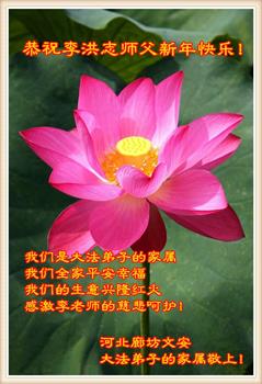 师父过年好!我姥姥是您的弟子,修炼二十年从没生过病,没吃过一粒药,渐渐的她的毅力感化了我,我也相信大法、同化大法。 祝您新年大吉!万事如意! 谢谢师父! 大法弟子家属敬上 河北廊坊大法弟子家属恭祝李洪志师父新年快乐!
